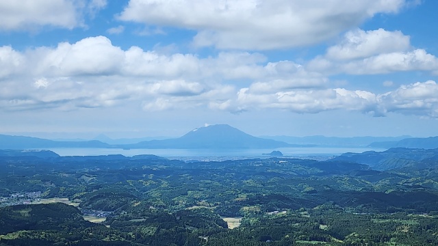 高台に上がり錦江湾と桜島を眺め